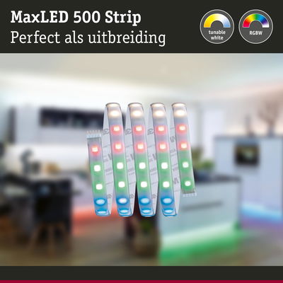 MaxLED-stripes zijn zo sterk dat ze zonder problemen kunnen worden gebruikt voor ruimteverlichting. Vooral in profielen zijn het echte blikvangers. Dankzij de sfeervolle kleurveranderingfunctie creëert u uw persoonlijke leefomgeving. Alles is mogelijk, van eenkleurige constante verlichting tot meerkleurige lichteffecten. Een witte diode (W) zorgt voor extra gezellig warmwit licht en maakt het mengen van rood, groen en blauw licht (RGB) tot wit licht overbodig. U kunt uw basisset bovendien met extra stripes naar wens uitbreiden. Let bij de planning vooral op de maximale lengte aangegeven op de basisset. Deze mag niet worden overschreden.
