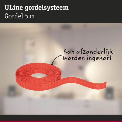 De ULine riem dient als basis voor het ULine riem-systeem. Hij is verkrijgbaar in twee lengtes (5 m en 10 m) en vijf kleuren - van klassiek zwart tot ongewoon oranje - en kan overal in de kamer worden geplaatst en indien nodig met een schaar worden ingekort. Bijpassende armaturen kunnen naar wens op de riem worden geplaatst. De 2,1 cm brede riem wordt met behulp van geschikte beugels aan de wand, het plafond of de vloer bevestigd. Zo kan in slechts een paar stappen een persoonlijk verlichtingsconcept worden geïmplementeerd. Het scheurbestendige en duurzame Textiel, Koper van de riem zorgt voor een lange levensduur en een hoge belastbaarheid. De banden zijn gecoat en gemakkelijk schoon te maken. Een speciaal hoogtepunt is de interne, onzichtbare kabelgeleiding, die zorgt voor een strakke look zonder zichtbare draden. Alles uit de riemen wordt geleverd met twee eindkappen van silicon voor een esthetische afwerking. Het ULine riem-systeem is een innovatieve oplossing voor unieke verlichtingservaringen in alle ruimtedimensies en maakt gerichte lichteffecten op wanden, plafonds en vloeren mogelijk.
