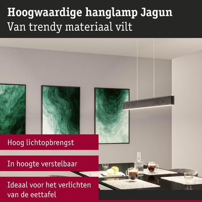 De in hoogte verstelbare LED hanglamp Jagun van vilt in Antraciet met 2000lm maakt niet alleen indruk met zijn moderne en eenvoudige ontwerp, maar creëert ook een aangename sfeer en vermindert storende achtergrondgeluiden. Bovendien is hij vervaardigd van duurzaam, gerecycled materiaal. Door de hoge lichtopbrengst is de hanglamp perfect geschikt voor het verlichten van eet- of conferentietafels. De warme kleurtemperatuur creëert een gezellige sfeer voor ontspannende uren thuis. De lamp kan met een gangbare wandschakelaar in 3 niveaus worden gedimd. Dankzij de memory-functie onthoudt de lamp altijd de voorkeursinstellingen.