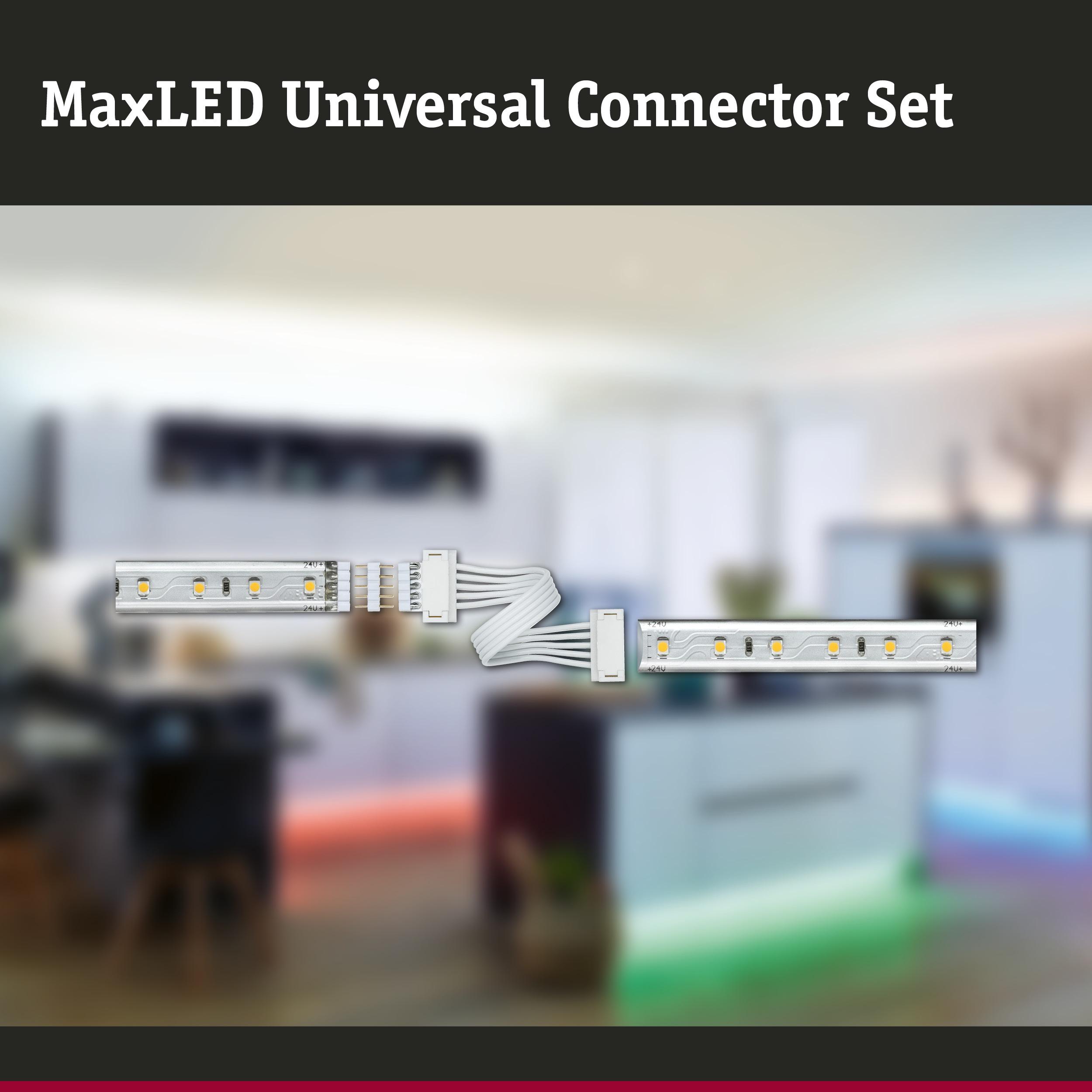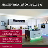 De MaxLED Universal Connector set bevat alles wat u nodig hebt voor het verbinden van ingekorte en niet-ingekorte MaxLED Strips. Door het flexibele materiaal kunnen de verbindingsstukken in elke willekeurige hoek worden gelegd en kunnen kleine hoogteverschillen eenvoudig worden gecompenseerd.