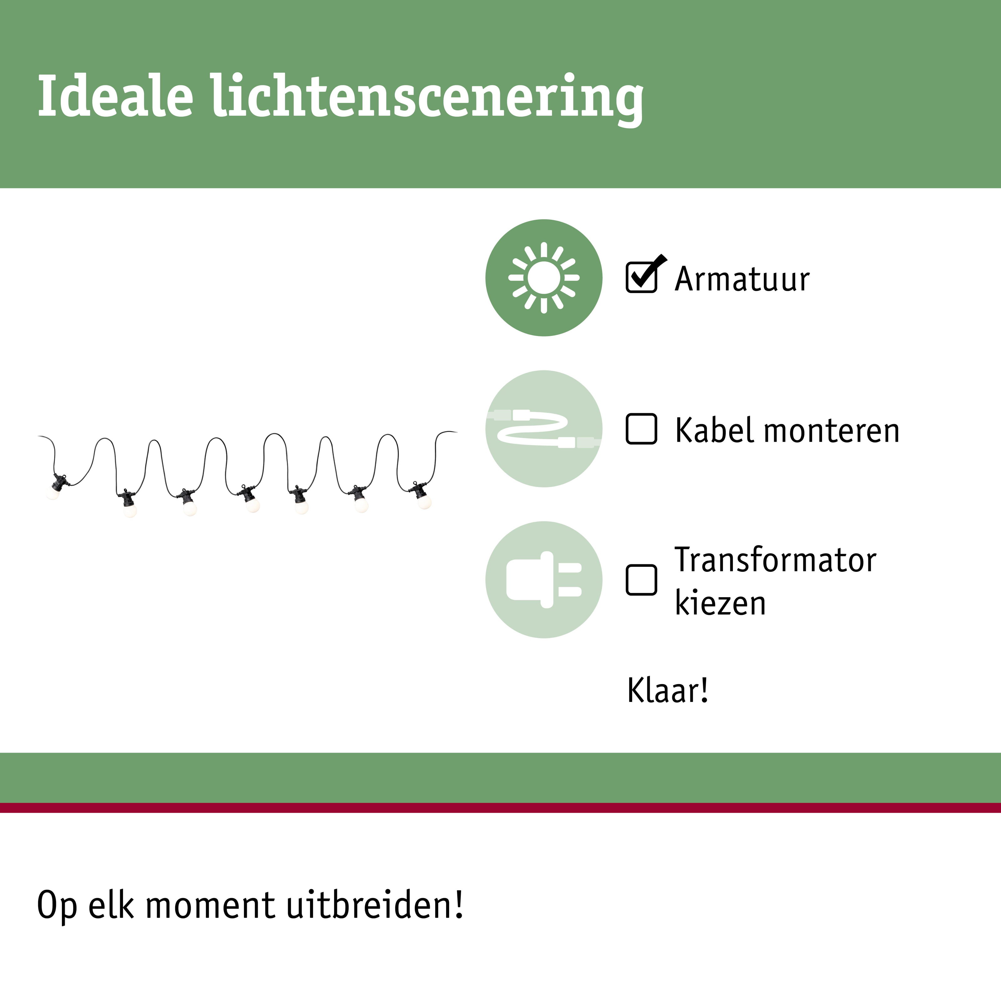GebruikVoor flexibele aanvullende verlichting in de tuin, bij zitjes of op het terras