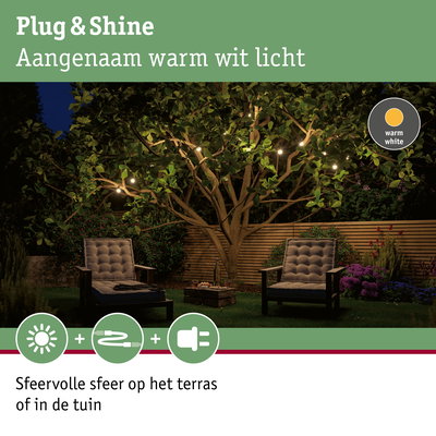 De Plug & Shine lichtketting zorgt met warmwit licht voor de perfecte sfeer buiten en kan flexibel om balustrades, meubelen en planten worden gewikkeld. Met trafo’s, verbindingen en andere armaturen uit de Plug & Shine-serie stelt u uw individuele lichtinstallatie voor buiten samen.