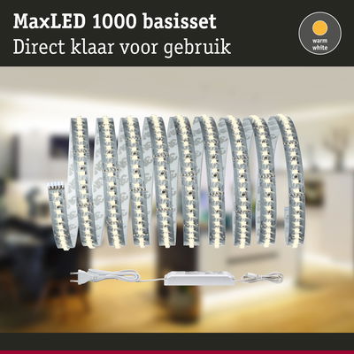 MaxLED-stripes zijn zo sterk dat ze zonder problemen kunnen worden gebruikt voor ruimteverlichting. Vooral in profielen zijn het echte blikvangers. Warmwitte stripes zorgen voor gezellig en ontspannen ruimte- en gebruiksverlichting. Afgezien van de stripes wordt de basisset met een geschikt voorschakelapparaat geleverd. De basisset kan bovendien worden uitgebreid met extra stripes, verbindingen en besturingseenheden met afstandsbediening. Let bij de planning vooral op de maximale lengte aangegeven op de basisset. Deze mag niet worden overschreden.