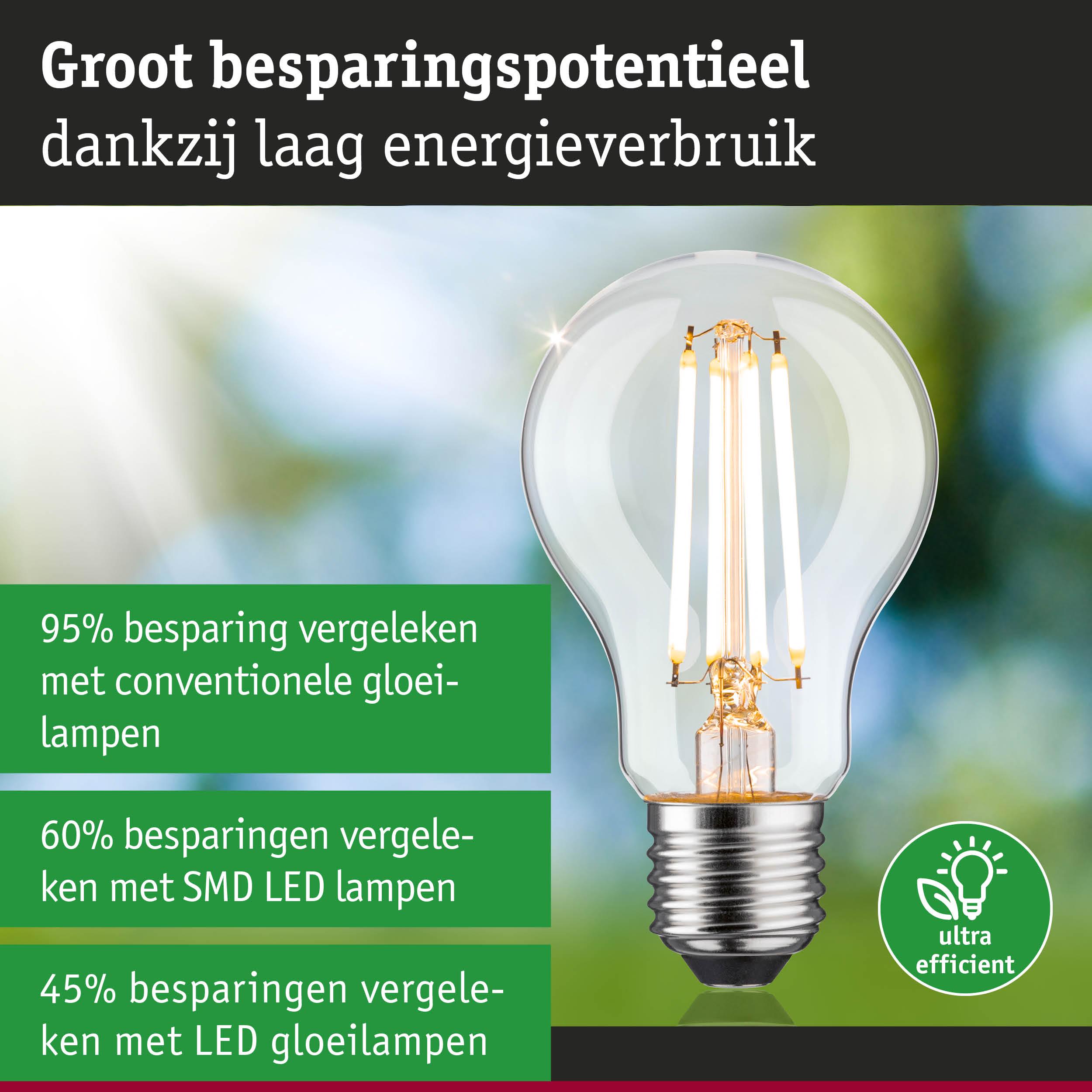 De uiterst efficiënte LED-verlichtingsmiddelen van LED Eco-Line combineren innovatieve techniek met duurzaamheid en zorgen voor een efficiënte en stijlvolle verlichting. Dankzij het 60% lagere energieverbruik en de aanzienlijk langere levensduur ten opzichte van standaard LED-lampen zijn de energiekosten beduidend lager en daarnaast is het ook nog goed voor het milieu. De heldere filament LED peer past in elke gangbare E27-fitting en creëert met 3000 K, een vermogen van 8,2W een aangenaam gelijkmatig warmwit licht zonder groene gloed. Zelfs grote lampenkappen worden gelijkmatig verlicht, waardoor in elke ruimte een gezellige sfeer wordt gecreëerd. Naar wens kan de helderheid van het verlichtingsmiddel in 3 stappen via een gangbare lichtschakelaar worden gedimd. De dimmer beschikt over een memory-functie. De Paulmann LED-lampen met Eye Friendly label bieden oogvriendelijk en comfortabel licht. Of u nu aan het werken, lezen of ontspannen bent, de lampen zorgen voor het beste zichtcomfort.