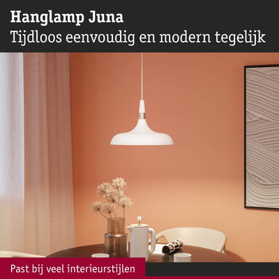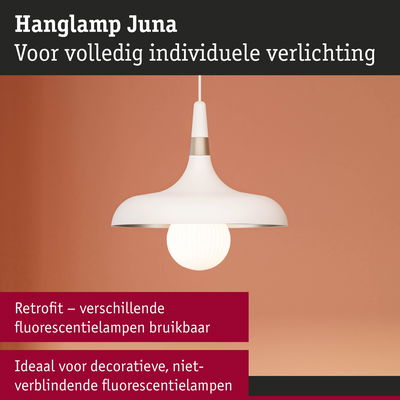 Met zijn tijdloze en toch moderne vorm- en designtaal past de armaturenserie Juna in de meest uiteenlopende interieurstijlen en zet aantrekkelijke lichtaccenten in de woonruimte. De op elkaar afgestemde tafel-, staande en hanglampen uit de serie kunnen naar wens perfect met elkaar worden gecombineerd. De wit matte hanglamp met esthetische kleuraccenten in champagnegoud is veelzijdig inzetbaar en is perfect geschikt voor de verlichting boven de eettafel of een keukenblad. De hoogwaardige afwerking zorgt niet alleen voor een aantrekkelijk uiterlijk, maar ook voor een lange levensduur. Decoratieve kopspiegellampen met een E27-fitting die niet-verblindend licht geven zijn bijzonder aanbevolen als geschikte lichtbronnen.