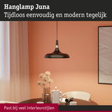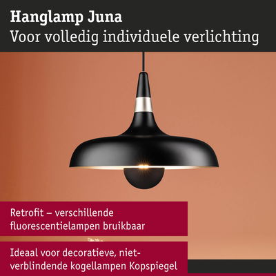 Met zijn tijdloze en toch moderne vorm- en designtaal past de armaturenserie Juna in de meest uiteenlopende interieurstijlen en zet aantrekkelijke lichtaccenten in de woonruimte. De op elkaar afgestemde tafel-, staande en hanglampen uit de serie kunnen naar wens perfect met elkaar worden gecombineerd. De zwart matte hanglamp met esthetische kleuraccenten in champagnegoud is veelzijdig inzetbaar en is perfect geschikt voor de verlichting boven de eettafel of een keukenblad. De hoogwaardige afwerking zorgt niet alleen voor een aantrekkelijk uiterlijk, maar ook voor een lange levensduur. Decoratieve kopspiegellampen met een E27-fitting die niet-verblindend licht geven zijn bijzonder aanbevolen als geschikte lichtbronnen.