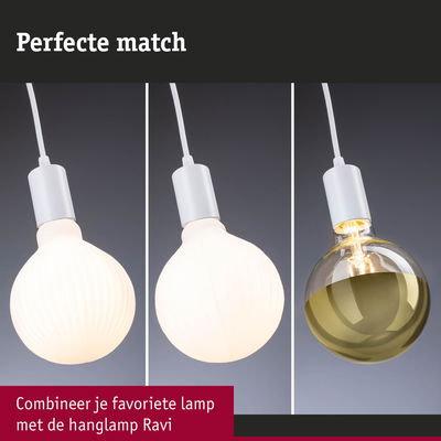 De Mix & Match-look is helemaal in de mode en maakt het mogelijk uw huis te verfraaien met een bijzondere blikvanger. De moderne hanglamp Ravi in Wit mat is daarvoor het perfecte bewijs. Met het minimalistische, moderne design en de aantrekkelijke kleurencombinatie wordt deze hanglamp een echte eyecatcher voor uw huis. In combinatie met de decoratieve lichtbronnen van Paulmann ontstaat een perfecte set. Vooral in combinatie met verlichtingsmiddelen uit de series White Lampion of Metallic Glow ziet de lamp er bijzonder harmonieus uit. Eventueel kunnen de lampen worden gebruikt met een E27-lampvoet tot max. 60 watt. Dankzij de IP44-bescherming kan de wandlamp Ravi zelfs in de badkamer worden gebruikt.