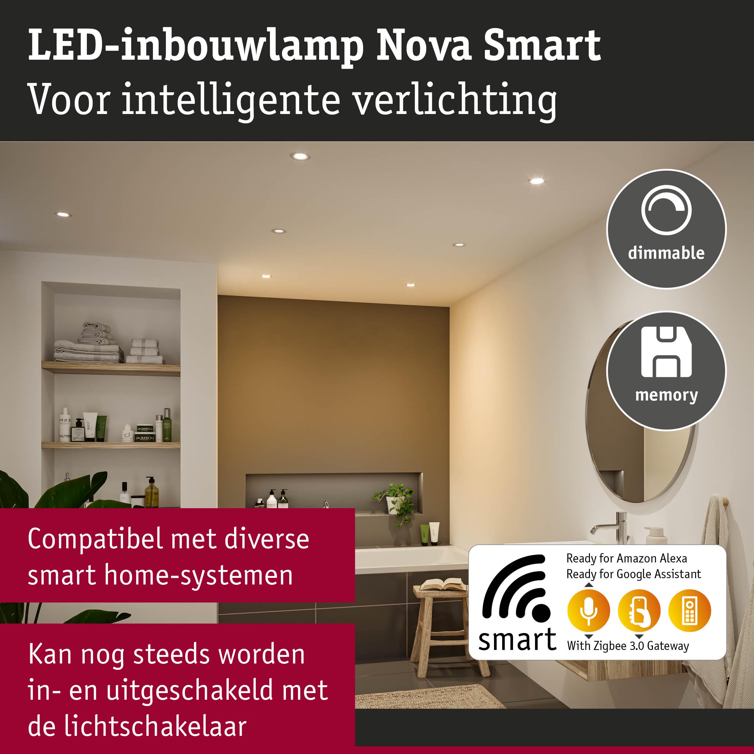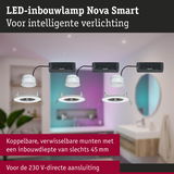16 miljoen kleuren, 16 miljoen lichtsferen – de smart inbouwlampen set Nova Coin in Wit mat met kleurveranderingsfunctie schept in elke ruimte een individuele woonsfeer. In de leveringsomvang zijn drie vervangbare LED-verlichtingsmiddelen en hoogwaardige aluminium inbouwringen inbegrepen. Dankzij de bijzonder hoge IP-bescherming van IP44 zijn de armaturen perfect geschikt voor vochtige ruimtes en beschermd tegen spatwater. Met een vermogen van 3x6 watt en ZigBee 3.0-besturing zorgen ze voor een efficiënte en innovatieve verlichtingsoplossing. Zigbee 3.0 is een draadloos overdrachtsprotocol dat apparaten van verschillende fabrikanten met elkaar verbindt. Zo kunnen de armaturen via de app, afstandsbediening of spraak afzonderlijk of gezamenlijk worden bestuurd: gezellig warm goudlicht (2200 K), zakelijk helder daglicht wit (6500 K) of een stralend kleurverloop - de combinatie van Tunable White, RGB en dimfunctie biedt talloze mogelijkheden. De smart inbouwlamp kan nog steeds eenvoudig en gemakkelijk via een gangbare lichtschakelaar worden in- en uitgeschakeld. Daarnaast zorgt het geïntegreerde memory-effect ervoor dat altijd de laatst gebruikte lichtinstelling wordt onthouden voor een maximaal comfort. Dankzij de zwenkbaarheid van het armatuur kan het licht op elke gewenste plek worden gericht. De set wordt erg gemakkelijk en efficiënt gemonteerd dankzij de koppelbare en vervangbare coins, de geringe inbouwdiepte van slechts 45 mm en de 230V-aansluiting.