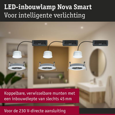 De smart inbouwlampen set Nova Coin in Alu gedraaid met kleurveranderingsfunctie schept in elke ruimte een individuele woonsfeer. In de leveringsomvang zijn drie vervangbare LED-verlichtingsmiddelen en hoogwaardige aluminium inbouwringen inbegrepen. Dankzij de bijzonder hoge IP-bescherming van IP44 zijn de armaturen perfect geschikt voor vochtige ruimtes en beschermd tegen spatwater. Met een vermogen van 3x6 watt en ZigBee 3.0-besturing zorgen ze voor een efficiënte en innovatieve verlichtingsoplossing. Zigbee 3.0 is een draadloos overdrachtsprotocol dat apparaten van verschillende fabrikanten met elkaar verbindt. Zo kunnen de armaturen via de app, afstandsbediening of spraak afzonderlijk of gezamenlijk worden bestuurd: gezellig warm goudlicht (2200 K), zakelijk helder daglicht wit (6500 K) - met de Tunable White-functie kan de lichtkleur naar wens traploos worden ingesteld. Met de traploze dimfunctie kan de helderheid naar wens worden aangepast, variërend van helder licht om te werken tot sfeervol licht om te ontspannen. De smart inbouwlampen kunnen nog steeds eenvoudig en gemakkelijk via een gangbare lichtschakelaar worden in- en uitgeschakeld. Daarnaast zorgt het geïntegreerde memory-effect ervoor dat altijd de laatst gebruikte lichtinstelling wordt onthouden voor een maximaal comfort. De set wordt erg gemakkelijk en efficiënt gemonteerd dankzij de koppelbare en vervangbare coins, de geringe inbouwdiepte van slechts 45 mm en de 230V-aansluiting.