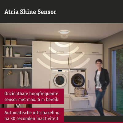 Met een vermogen van 16W is het ronde LED-paneel Atria Shine in Wit en 293mm ideaal als basisverlichting van functionele ruimtes, zoals bijkeukens, opslagruimtes, voorraadkasten en gangen. Door de IP44-bescherming is het paneel ook geschikt voor gebruik in de badkamer of bijv. het gastentoilet. Met zijn geïntegreerde bewegingsmelder draagt het bij aan de energiebesparing in ruimtes die niet continu in gebruik zijn en schakelt na 30 seconden inactiviteit automatisch uit. De bewegingsmelder werkt volautomatisch, er zijn geen instellingen vereist. Het neutraal witte licht van het paneel creëert een gelijkmatige en egale ruimteverlichting. De extra backlight techniek creëert een interessant lichteffect en geeft het paneel een bijna zwevende lichtoptiek. Dankzij de snelklem en de speciale draaivergrendeling is het paneel met zijn ultravlakke opbouwhoogte van 30 mm zeer montagevriendelijk.