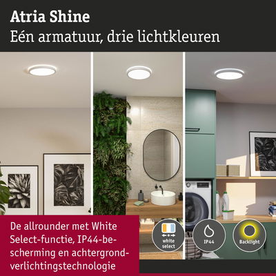 Het ronde Atria Shine Panel in Wit is met zijn hoge energie-efficiëntie en vele lichtkleuren een echte allrounder! Met zijn verbeterde energie-efficiëntie, die is verhoogd van klasse E naar klasse B, biedt het nieuwe Atria Shine Panel een innovatieve en toekomstbestendige verlichtingsoplossing. Het aanzienlijk lagere energieverbruik is niet alleen goed voor het milieu, maar dankzij de lage energiekosten ook goed voor uw portemonnee. Voor de montage kan er via de White Select schakelaar tussen drie lichtkleuren worden gekozen: warmwit (3000 K), neutraal wit (4000 K) of daglicht wit (6500 K). Of het nu is voor sfeervolle verlichting in de woonruimte, functionele verlichting in de keuken of heldere verlichting in de werkkamer – voor elke ruimte is er een passende lichtsfeer. Met een indrukwekkende helderheid van 14,8W is het Atria Shine Panel ook ideaal voor veeleisende toepassingen waarbij veel licht nodig is. Optisch overtuigt het armatuur dankzij de effectvolle backlight-techniek met een nagenoeg zwevend verschijningsbeeld. Door zijn sobere design past hij optimaal in individuele interieurstijlen en kan dankzij de IP44-bescherming ook in de badkamer worden gebruikt. De montage aan de wand of aan het plafond is met de eenvoudige draaisluiting en snelklem heel gemakkelijk.