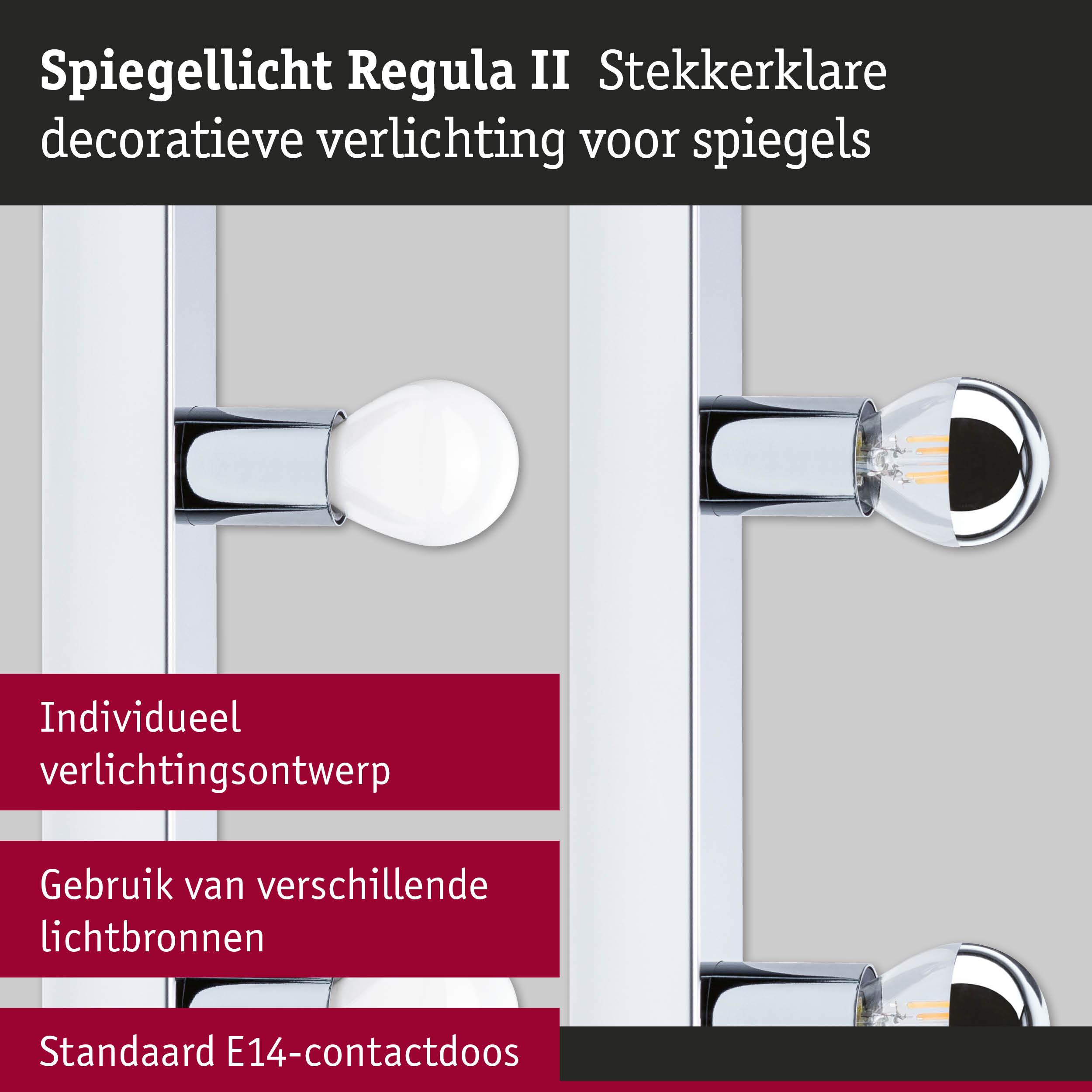 De 4-vlammige Regula II is de ideale keuze voor een decoratieve spiegelverlichting. Hij wordt met een praktische textiel kabelschakelaar in de kleur Chroom geleverd, zodat de montage kinderlijk eenvoudig is. Je hebt alleen een contactdoos nodig, een stroomaansluitpunt is niet meer vereist. Met zijn moderne en strakke design in Chroom past hij perfect in verschillende interieurstijlen en is zowel bij de make-uptafel als ook op de gang een echte blikvanger. Met een lengte van 60 cm is hij afgestemd op standaardafmetingen van spiegels. Door het gebruik van verschillende lichtbronnen met E14-fitting kan hij aan de eigen toepassing worden aangepast. Verspiegelde lampen zijn in het bijzonder geschikt voor een betoverende make-up spiegel in Hollywood-stijl. Ze zorgen voor een niet-verblindende verlichting en creëren aantrekkelijke lichtreflecties. Een modern-klassieke look daarentegen ontstaat door het gebruik van een opaal verlichtingsmiddel, dat rondom een stralend licht afgeeft. De installatie van de Regula II is zeer eenvoudig: hij kan boven of naast de spiegel aan de wand worden gemonteerd. Na het indraaien van het gewenste verlichtingsmiddel is hij direct klaar voor gebruik. Een zachte doek is het beste geschikt om de armaturen schoon te maken – gebruik geen microvezeldoek.