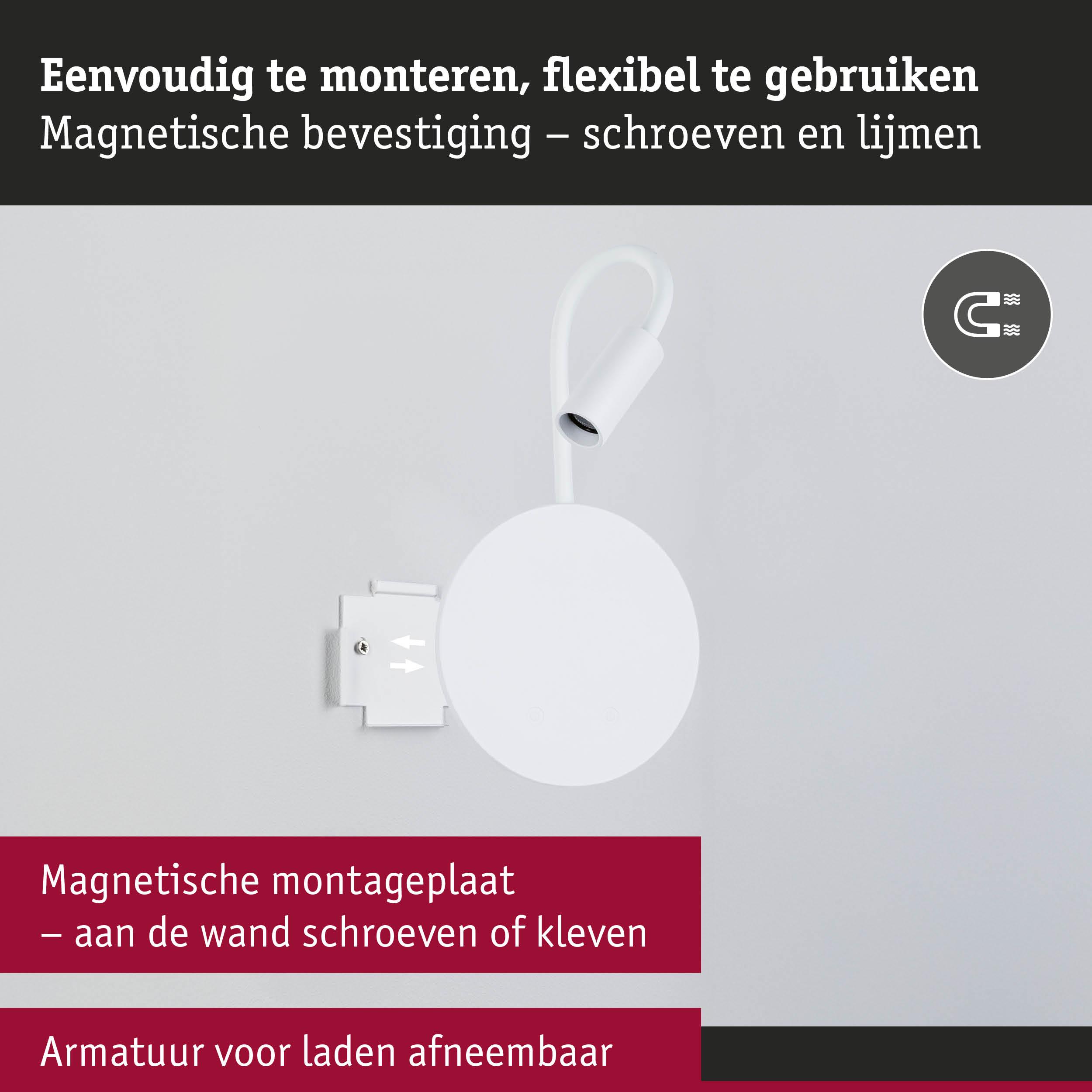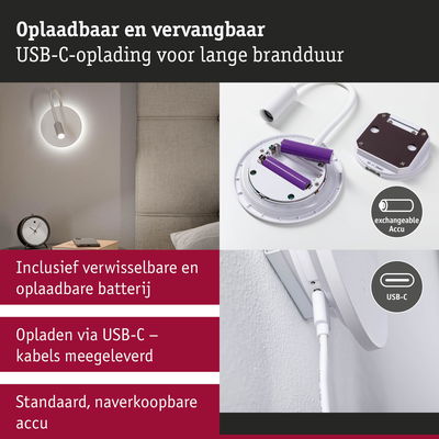 De accu-wandlamp Miora in Wit met zwenkbare en flexibele armatuurarm is maximaal aanpasbaar en biedt een veelzijdige verlichtingsoplossing. Omdat er geen stopcontact nodig is, kan hij flexibel worden gebruikt als leeslamp, in de slaapkamer of in de gang bij het sleutelrek. Het warmwitte licht zorgt voor sfeervolle indirecte verlichting en directe verlichting voor een optimale leeservaring. Indien gewenst kan het licht afzonderlijk worden geschakeld en traploos worden gedimd met de touchschakelaar op de armatuur. De geïntegreerde geheugenfunctie slaat de laatst gekozen lichtinstelling op totdat de lamp weer wordt ingeschakeld. Bij maximale helderheid is de brandduur 6 uur en in gedimde toestand zelfs tot 50 uur. De meegeleverde USB-C-oplaadkabel garandeert een snelle oplaadbeurt van de verwisselbare accu in 6-8 uur. Voor de montage kan de meegeleverde magnetische achterplaat op de wand worden geplakt of geschroefd. Hierdoor kan de armatuur eenvoudig en snel worden verwijderd om te worden opgeladen.