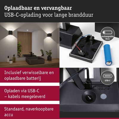 - vervangbare accu is snel oplaadbaar via USB-C aansluiting
