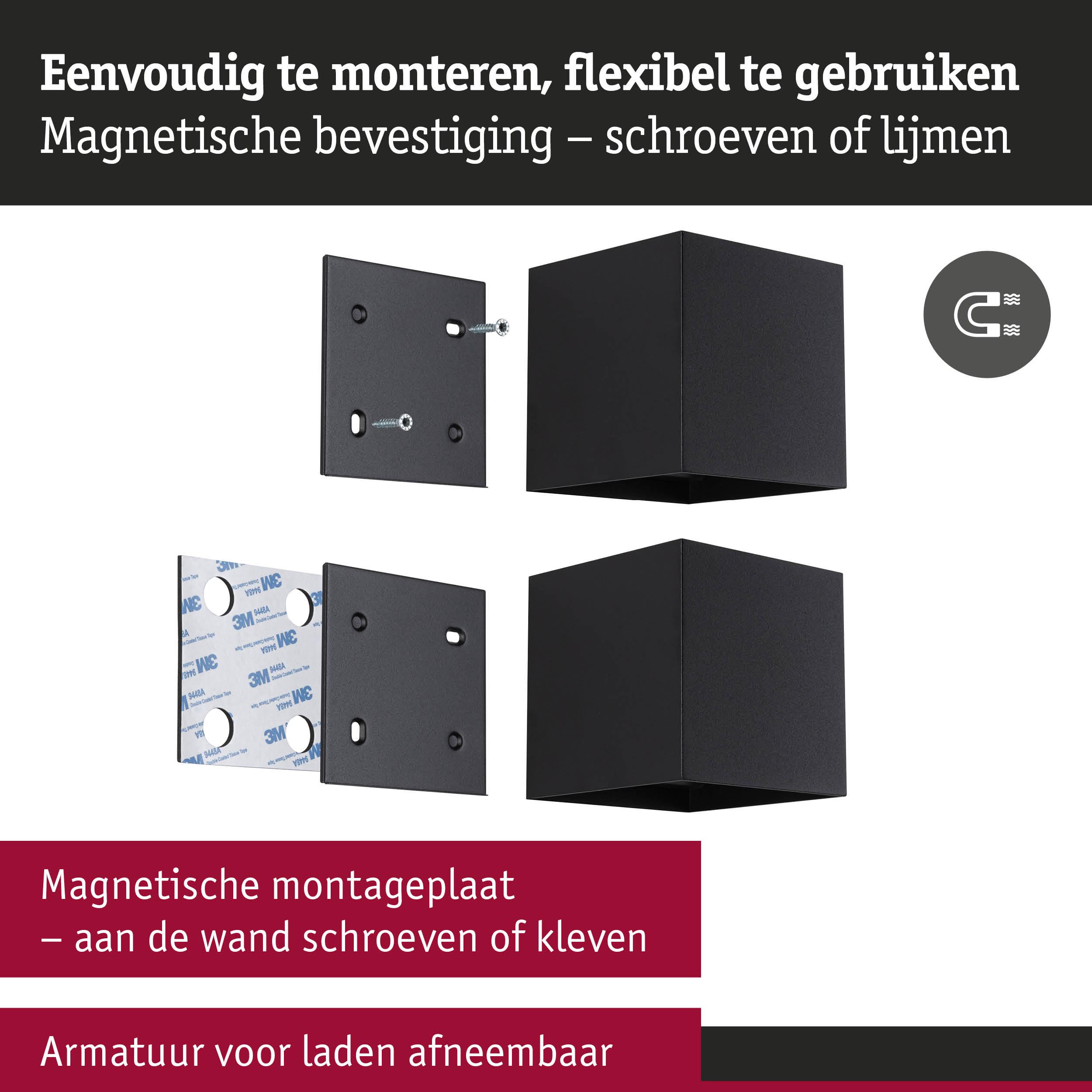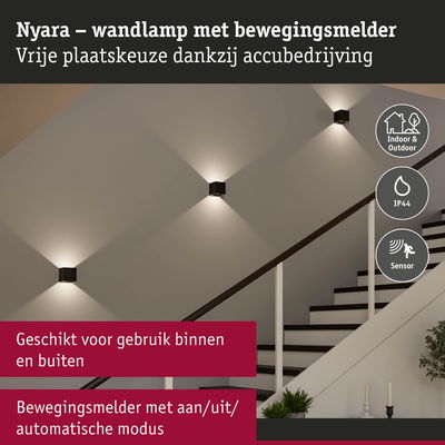 De hoekige accuwandlamp Nyara in Zwart met bewegingsmelder is optimaal geschikt als functionele decoratieve lamp of als oriëntatieverlichting. Omdat hij geen stroomaansluitpunt nodig heeft, kan de lamp flexibel worden gebruikt in de woonkamer, hal en dankzij de IP44-bescherming zelfs in de badkamer, op het balkon of de huismuur. De lamp heeft drie instelmogelijkheden: On, Off en Auto In de On-modus geeft de lamp continu warmwit licht met een helderheid van 40%. In de Auto-modus wordt de schemeringsbestuurde bewegingsmelder geactiveerd en het licht schakelt automatisch naar 100% lichtsterkte - voor maximaal comfort en veiligheid. In de Auto-Modus bedraagt de verlichtingsduur 8 h, in de On-modus 23 h. Als er geen beweging wordt gedetecteerd, of als de helderheid van de omgeving 30 lux overschrijdt, schakelt de lamp zichzelf na 30 seconden weer uit. Met de USB-C laadkabel die in de leveringsomvang is inbegrepen, is de vervangbare accu altijd snel opgeladen in 6 uur. Montage is mogelijk met de meegeleverde magnetische achterplaat, die aan de wand wordt geplakt of geschroefd. De lamp kan zo gemakkelijk en snel worden verwijderd om te worden opgeladen.