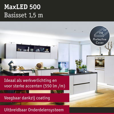 MaxLED-stripes zijn zo sterk dat ze zonder problemen kunnen worden gebruikt voor ruimteverlichting. Vooral in profielen zijn het echte blikvangers. Daglichtwitte stripes zorgen voor activerende en de concentratie bevorderende ruimte- en gebruiksverlichting. Afgezien van de stripes wordt de basisset met een geschikt voorschakelapparaat geleverd. De basisset kan bovendien worden uitgebreid met extra stripes, verbindingen en besturingseenheden met afstandsbediening. Let bij de planning vooral op de maximale lengte aangegeven op de basisset. Deze mag niet worden overschreden.