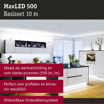 MaxLED-stripes zijn zo sterk dat ze zonder problemen kunnen worden gebruikt voor ruimteverlichting. Vooral in profielen zijn het echte blikvangers. Daglichtwitte stripes zorgen voor een activerende en de concentratie bevorderende ruimte- en werkverlichting. De basisset bevat behalve de stripe een passend voorschakelapparaat. Hij kan naar wens worden uitgebreid met een besturingseenheid met afstandsbediening.