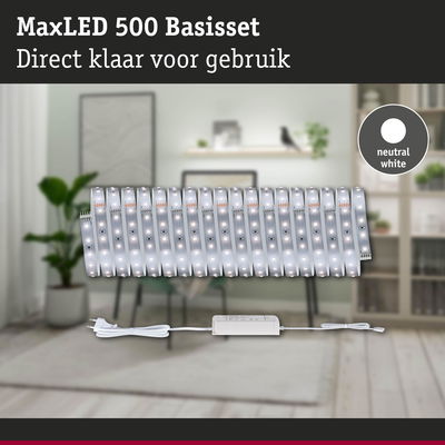 De neutraalwitte MaxLED 500 basisset is de ideale keuze voor een moderne en zeer energie-efficiënte verlichtingsoplossing. Vergeleken met conventionele lampen verbruikt de LED strip 40% minder energie bij dezelfde lichtoutput. De strip is uitstekend geschikt voor de toepassing in profielen en zorgt met een kleurtemperatuur van 4000K voor een gezellig en niet-verblindend werklicht. Om op elk gewenst moment de gewenste lichtsfeer te creëren, kan de helderheid flexibel worden gedimd. De strip kan heel eenvoudig worden ingekort met een schaar, waardoor hij heel gemakkelijk aan de ruimtelijke omstandigheden kan worden aangepast. De strip kan probleemloos op meubels, kasten of wanden worden aangebracht, wat veelzijdige ontwerpmogelijkheden biedt. De basisset bevat behalve de stripe een passend voorschakelapparaat. Hij kan naar wens worden uitgebreid met een besturingseenheid met afstandsbediening.