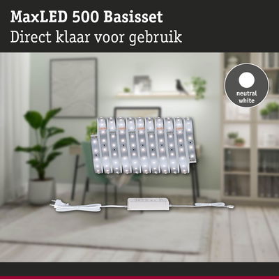 De neutraalwitte MaxLED 500 basisset is de ideale keuze voor een moderne en zeer energie-efficiënte verlichtingsoplossing. Vergeleken met conventionele lampen verbruikt de LED strip 40% minder energie bij dezelfde lichtoutput. De strip is uitstekend geschikt voor de toepassing in profielen en zorgt met een kleurtemperatuur van 4000K voor een gezellig en niet-verblindend werklicht. Om op elk gewenst moment de gewenste lichtsfeer te creëren, kan de helderheid flexibel worden gedimd. De strip kan heel eenvoudig worden ingekort met een schaar, waardoor hij heel gemakkelijk aan de ruimtelijke omstandigheden kan worden aangepast. De strip kan probleemloos op meubels, kasten of wanden worden aangebracht, wat veelzijdige ontwerpmogelijkheden biedt. De basisset bevat behalve de stripe een passend voorschakelapparaat. Hij kan naar wens worden uitgebreid met een besturingseenheid met afstandsbediening.