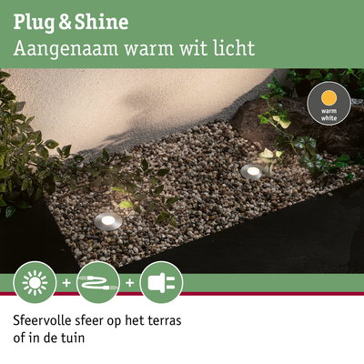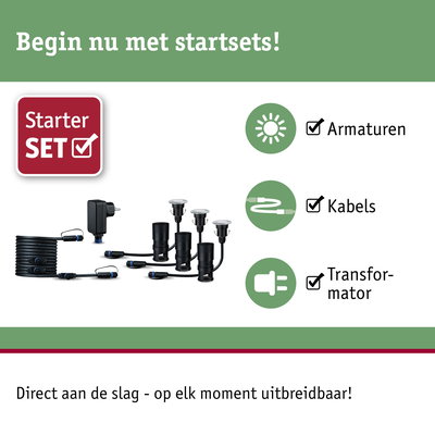 - Plug & Shine basisset bestaande uit 3 armaturen, 5 meter verbindingskabel en trafo