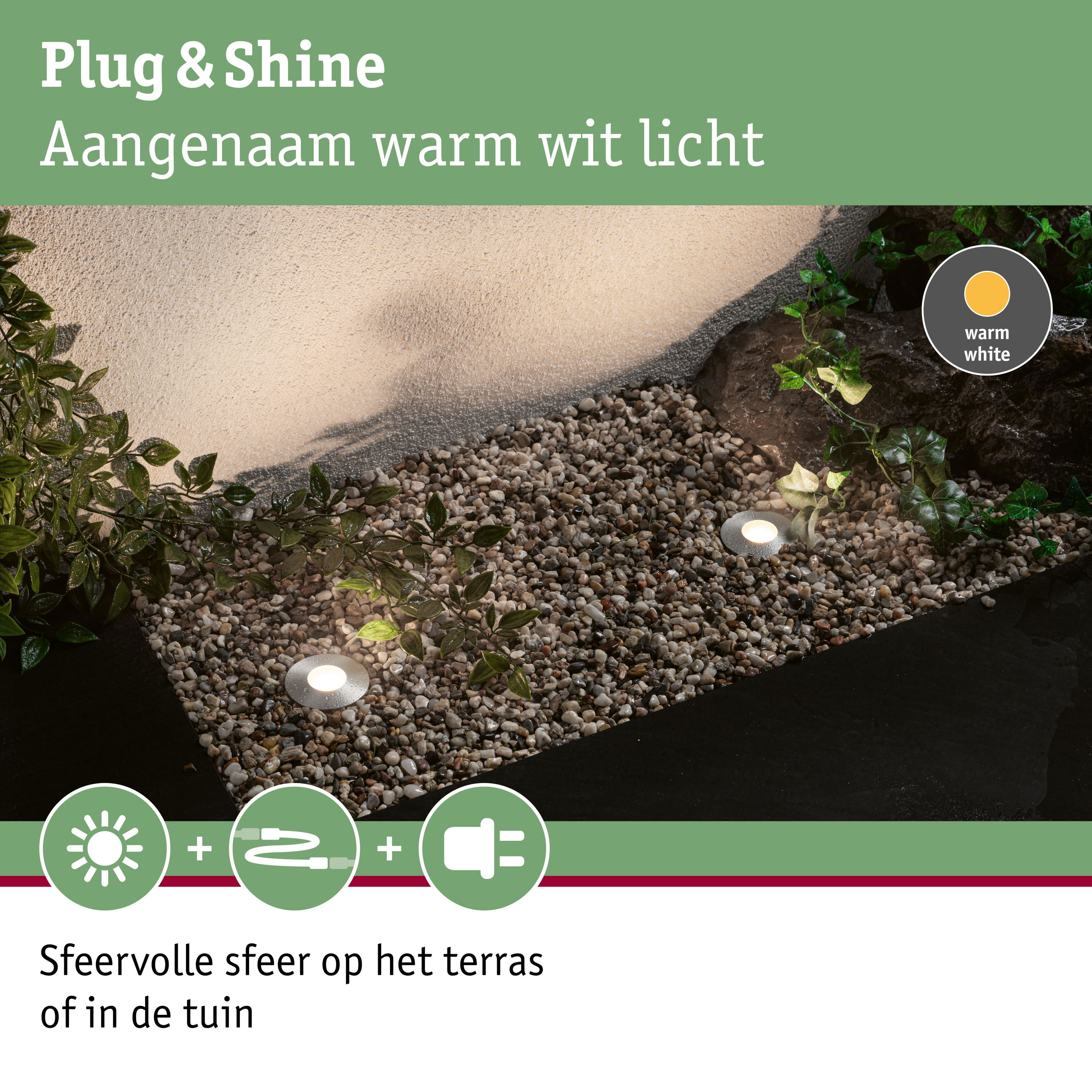Plug & Shine Floor Mini grondinbouwspots zorgen voor decoratieve warmwitte lichtpunten aan paden, in inritten of op terrassen. Met deze uitbreidingsset hebt u de mogelijkheid om tot drie extra lampen op uw bestaande 24V-lichtinstallatie aan te sluiten. Een verbindingskabel met drie aansluitbussen is bijgeleverd. Niet-benodigde uitgangen worden met de bijgeleverde afdekkappen afgesloten, om de IP67-classificatie (dompeldicht) van de verbinding te garanderen. Je kunt er niet over lopen of rijden. Opmerking: voor de installatie is een Trafo nodig, die niet bij de uitbreidingsset wordt meegeleverd.