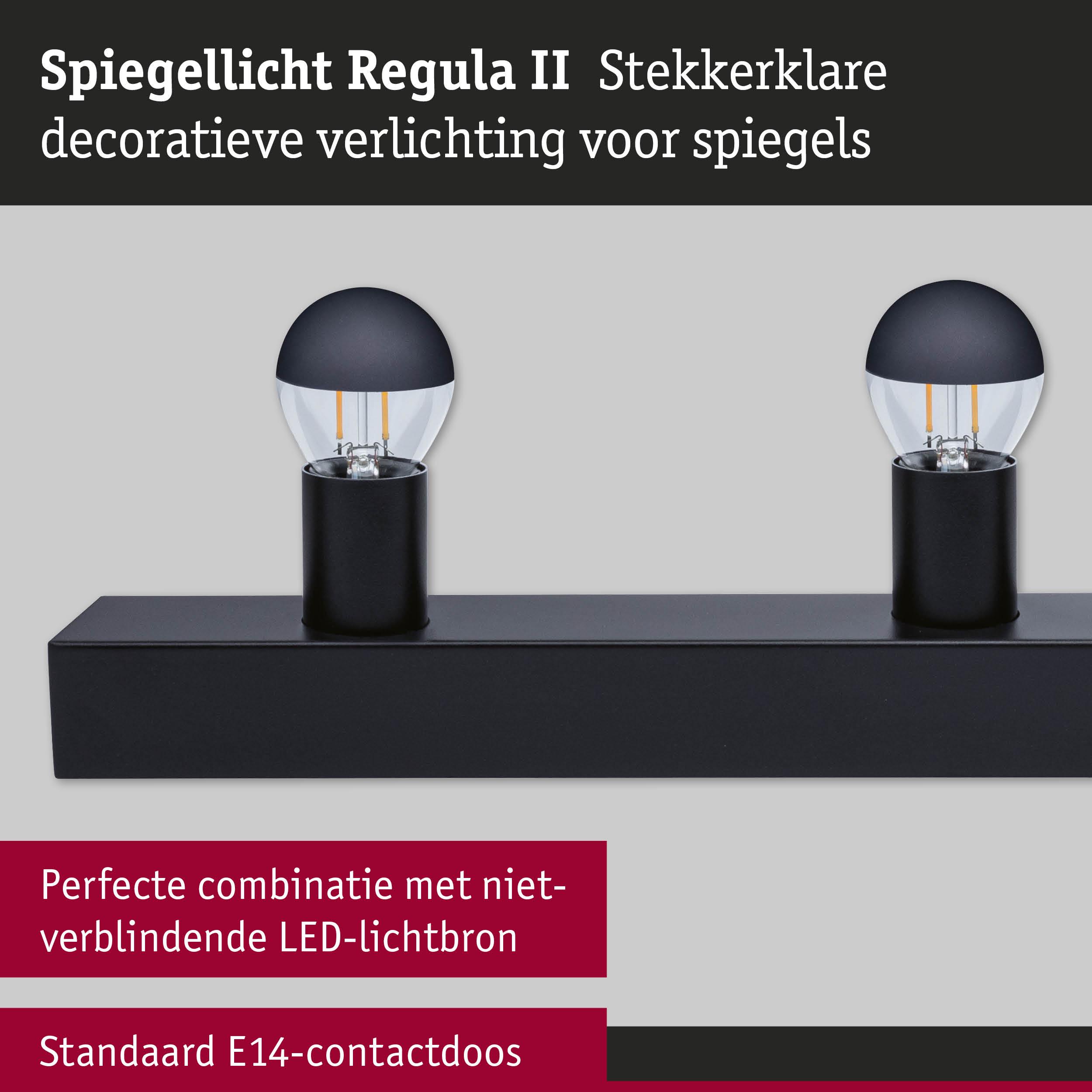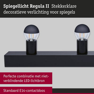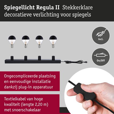 Stralend mooi – de ideale verlichtingsoplossingen voor de badkamer. Deze praktische set bevat de Regula II lichtstrip in Zwart/Kopspiegel zwart mat inclusief 4 geschikte kopspiegellampen. De 4-vlammige spiegellamp wordt geleverd met een praktische textiel kabelschakelaar, zodat de montage kinderlijk eenvoudig is. Je hebt alleen een contactdoos nodig, een stroomaansluitpunt is niet meer vereist. Met zijn moderne en strakke design past hij harmonieus in verschillende interieurstijlen en is optisch een echte blikvanger, bijvoorbeeld op een make-uptafel of in de gang. Met een lengte van 60 cm is hij afgestemd op standaardafmetingen van spiegels. In de leveringsomvang zijn 4 kopspiegel kogellampen inbegrepen in Zwart/Kopspiegel zwart mat die de make-upspiegel een glamoureuze Hollywood-look geven. Met een vermogen van 4x2,5W verspreiden ze warmwit licht in alle richtingen. De helderheid kan naar behoefte individueel worden gedimd. De installatie van de Regula II is zeer eenvoudig: hij kan boven of naast de spiegel aan de wand worden gemonteerd. Na het indraaien van de kopspiegel kogellampen of andere gewenste lichtbronnen met een E14 fitting, is deze meteen klaar voor gebruik. Zo staat er niks meer in de weg voor een aangename lichtsfeer in de badkamer. Een zachte doek is het beste geschikt om de armaturen schoon te maken – gebruik geen microvezeldoek.