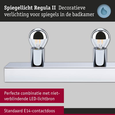 Stralend mooi – de ideale verlichtingsoplossingen voor de badkamer. Deze praktische set bevat de Regula II lichtstrip in Chroom, Kopspiegel zilver inclusief geschikte kopspiegellampen. Door zijn bijzonder hoge IP-bescherming van IP44 is de 4-vlammige Regula II lichtstrip beschermd tegen spatwater en is dus ideaal voor gebruik in de badkamer of andere vochtige ruimtes. Met zijn moderne en strakke design in is hij universeel inzetbaar in verschillende interieurstijlen. De lengte van 45 cm is aangepast aan de standaardafmetingen van spiegels en is ook bijzonder geschikt voor kleinere spiegels die vaak in het gastentoilet worden toegepast. In de leveringsomvang zijn 4 kopspiegel kogellampen inbegrepen in Chroom, Kopspiegel zilver die de make-upspiegel een glamoureuze Hollywood-look geven. Met een vermogen van 4x4,8W verspreiden ze warmwit licht in alle richtingen. De helderheid kan naar behoefte individueel worden gedimd. De installatie van de Regula II is zeer eenvoudig: hij kan boven of naast de spiegel aan de wand worden gemonteerd. Na het indraaien van de kopspiegel kogellampen of andere gewenste lichtbronnen met een E14 fitting, is deze meteen klaar voor gebruik. Zo staat er niks meer in de weg voor een aangename lichtsfeer in de badkamer. Een zachte doek is het beste geschikt om de armaturen schoon te maken – gebruik geen microvezeldoek. De lamp is dimbaar. De dimbaarheid is afhankelijk van het gebruikte verlichtingsmiddel.