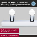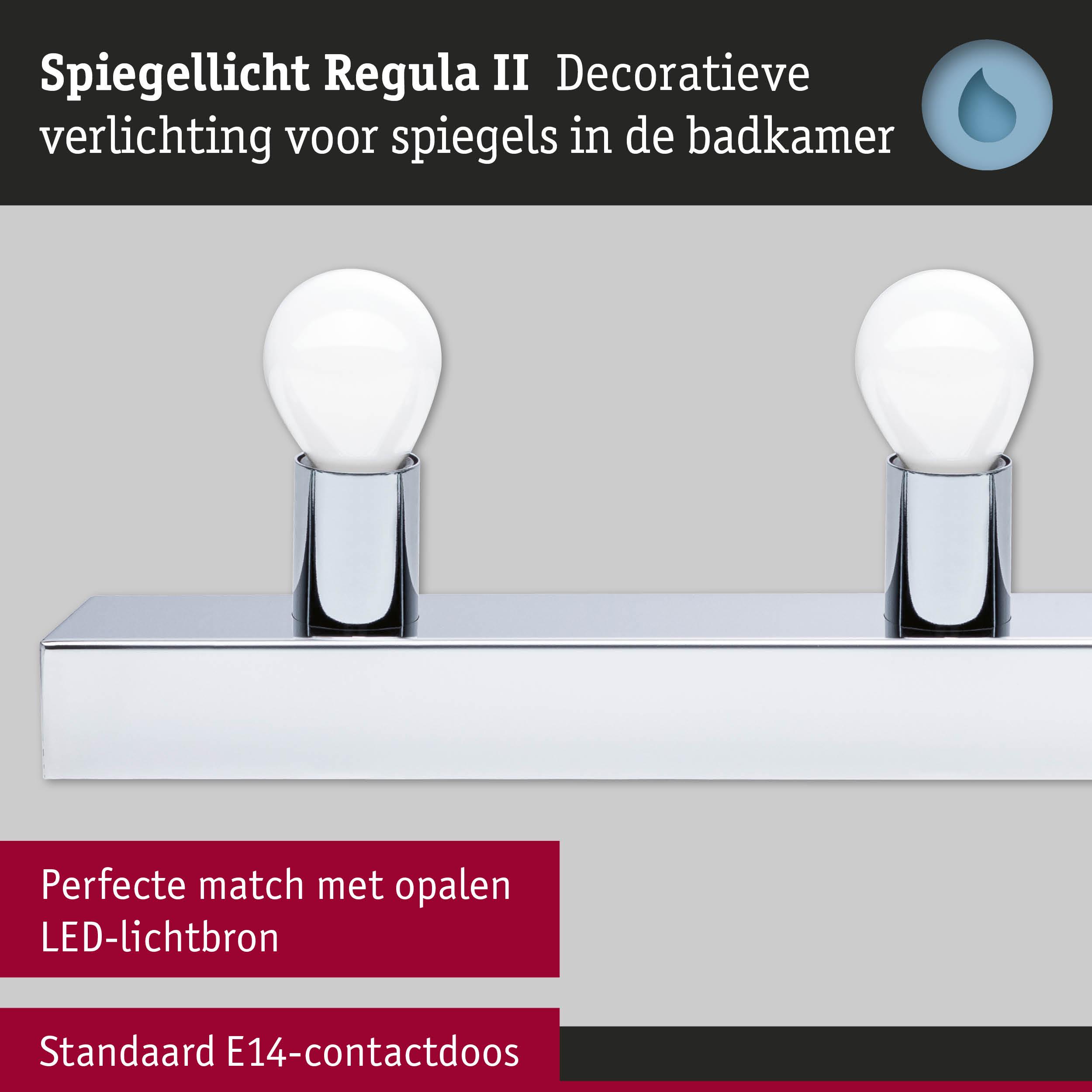 Stralend mooi – de ideale verlichtingsoplossingen voor de badkamer. Deze praktische set bevat de Regula II lichtstrip in Chroom/Opaal inclusief geschikte opaal LED-verlichtingsmiddelen. Door zijn bijzonder hoge IP-bescherming van IP44 is de 4-vlammige Regula II lichtstrip beschermd tegen spatwater en is dus ideaal voor gebruik in de badkamer of andere vochtige ruimtes. Met zijn moderne en strakke design in is hij universeel inzetbaar in verschillende interieurstijlen. De lengte van 45 cm is aangepast aan de standaardafmetingen van spiegels en is ook bijzonder geschikt voor kleinere spiegels die vaak in het gastentoilet worden toegepast. In de leveringsomvang zijn 4 kogelvormige LED-verlichtingsmiddelen inbegrepen in Chroom/Opaal die de spiegellamp een modern-klassieke look geven. Met een vermogen van 4x4,5W verspreiden ze rondom warmwit stralend licht. De helderheid kan naar behoefte individueel worden gedimd. De installatie van de Regula II is zeer eenvoudig: hij kan boven of naast de spiegel aan de wand worden gemonteerd. Na het indraaien van de opaal LED-verlichtingsmiddelen of andere gewenste lichtbronnen met E14-fitting is hij meteen klaar voor gebruik. Zo staat er niks meer in de weg voor een aangename lichtsfeer in de badkamer. Een zachte doek is het beste geschikt om de armaturen schoon te maken – gebruik geen microvezeldoek.