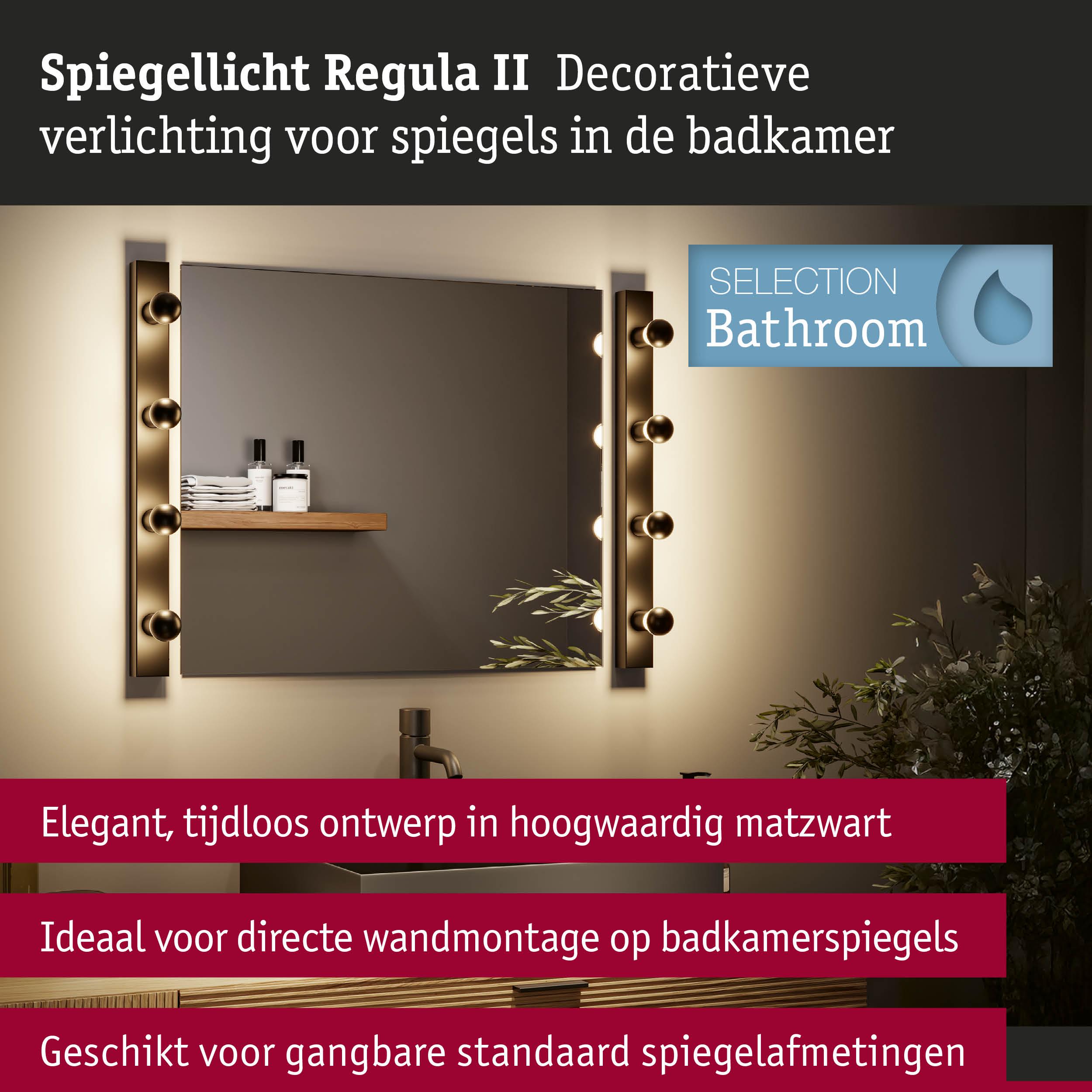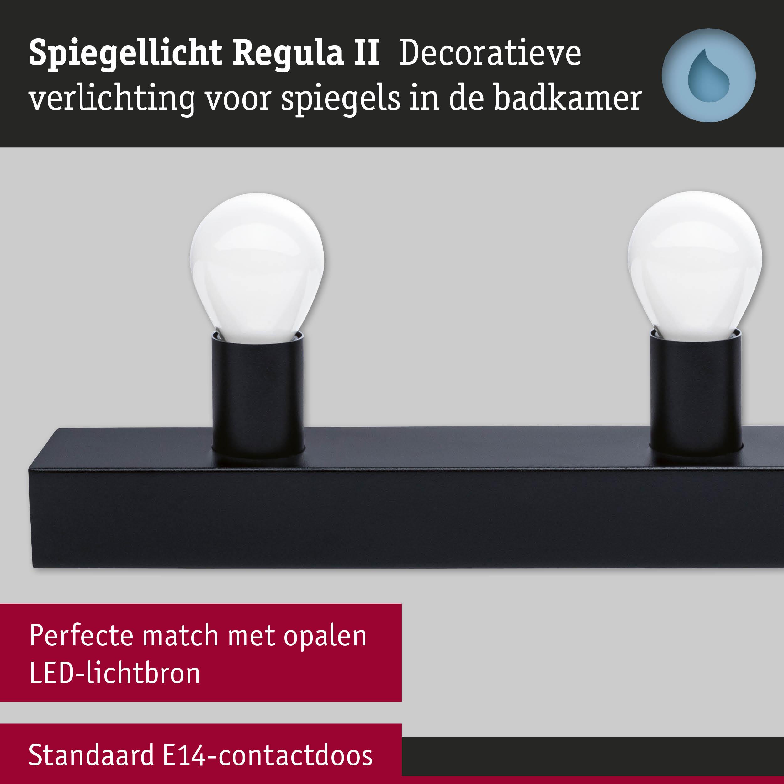 Stralend mooi – de ideale verlichtingsoplossingen voor de badkamer. Deze praktische set bevat de Regula II lichtstrip in Zwart/Opaal inclusief geschikte opaal LED-verlichtingsmiddelen. Door zijn bijzonder hoge IP-bescherming van IP44 is de 4-vlammige Regula II lichtstrip beschermd tegen spatwater en is dus ideaal voor gebruik in de badkamer of andere vochtige ruimtes. Met zijn moderne en strakke design in is hij universeel inzetbaar in verschillende interieurstijlen. De lengte van 45 cm is aangepast aan de standaardafmetingen van spiegels en is ook bijzonder geschikt voor kleinere spiegels die vaak in het gastentoilet worden toegepast. In de leveringsomvang zijn 4 kogelvormige LED-verlichtingsmiddelen inbegrepen in Zwart/Opaal die de spiegellamp een modern-klassieke look geven. Met een vermogen van 4x4,5W verspreiden ze rondom warmwit stralend licht. De helderheid kan naar behoefte individueel worden gedimd. De installatie van de Regula II is zeer eenvoudig: hij kan boven of naast de spiegel aan de wand worden gemonteerd. Na het indraaien van de opaal LED-verlichtingsmiddelen of andere gewenste lichtbronnen met E14-fitting is hij meteen klaar voor gebruik. Zo staat er niks meer in de weg voor een aangename lichtsfeer in de badkamer. Een zachte doek is het beste geschikt om de armaturen schoon te maken – gebruik geen microvezeldoek.
