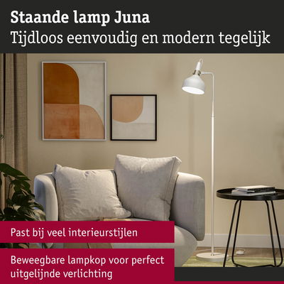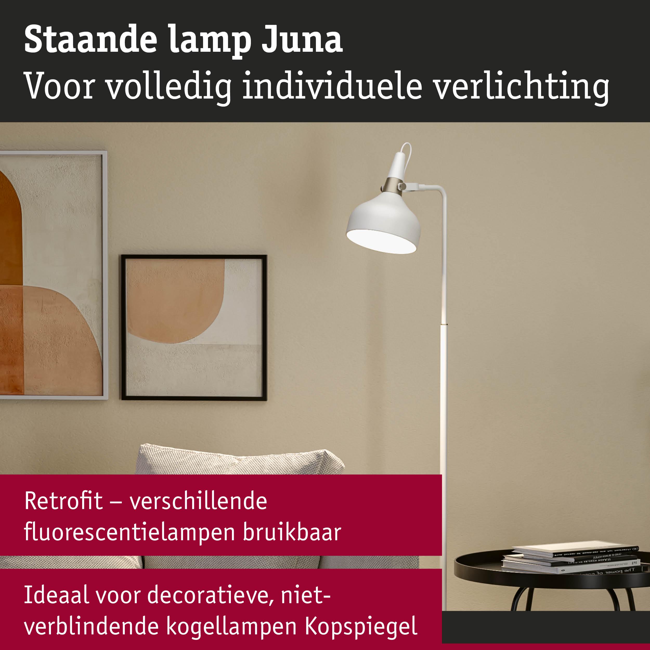 Met zijn tijdloze en toch moderne vorm- en designtaal past de armaturenserie Juna in de meest uiteenlopende interieurstijlen en zet aantrekkelijke lichtaccenten in de woonruimte. De op elkaar afgestemde tafel-, staande en hanglampen uit de serie kunnen naar wens perfect met elkaar worden gecombineerd. De wit matte staande lamp met esthetische kleuraccenten in champagnegoud is veelzijdig inzetbaar en is perfect geschikt als extra verlichting bij het bed, voor een gezellige leeshoek of naast de bank in de woonkamer. De hoogwaardige afwerking zorgt niet alleen voor een aantrekkelijk uiterlijk, maar ook voor een lange levensduur. De beweeglijke armatuurkop maakt een flexibel richten van het licht mogelijk, terwijl de qua kleur afgestemde textielkabel voor een handig en veilig gebruik zorgt. Decoratieve kopspiegellampen met een E14-fitting die niet-verblindend licht geven zijn bijzonder aanbevolen als geschikte lichtbronnen.