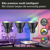 De LED reflector (set van 3) in Zwart mat met RGBW+, een vermogen van 3x4,8W en 3x350lm creëert een aangenaam gelijkmatig licht. De lamp past in elke standaard GU10 fitting en is vooral geschikt voor rail- of kabelsystemen. De verlichtingsmiddel is compatibel met Zigbee 3.0. Zigbee 3.0 is een draadloos overdrachtsprotocol dat apparaten van verschillende fabrikanten met elkaar verbindt. Afhankelijk van uw stemming kunt u kiezen uit echt warmwit, gekleurd licht en verschillende effecten. Reflectorlampen zorgen voor gericht licht in hanglampen, spots en spreidlichten. Ze geven het licht uitsluitend naar voren af en vestigen de aandacht op schilderijen, decoratie of hele wandoppervlakken door deze gericht te belichten. De Paulmann LED-lampen met Eye Friendly label bieden oogvriendelijk en comfortabel licht. Bij het werken, lezen of ontspannen zorgen de lampen voor het beste zichtcomfort.