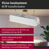 Deze hoogwaardige en krachtige Trafo met 48 V DC is optimaal afgestemd op het ULine Gordel-systeem en is geschikt voor individuele installaties tot max. 60 W. Met een levensduur van 50.000 uur is hij bijzonder robuust en duurzaam. Een geïntegreerde temperatuur-, overbelastings- en kortsluitbeveiliging garandeert een veilige en betrouwbare stroomvoorziening. Het ULine gordel-systeem is een innovatieve oplossing voor unieke lichtbelevingen in alle ruimtelijke dimensies en maakt een gerichte lichtinscenering op wanden, plafonds en vloeren mogelijk.