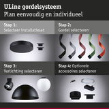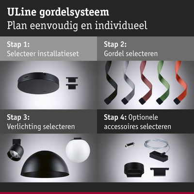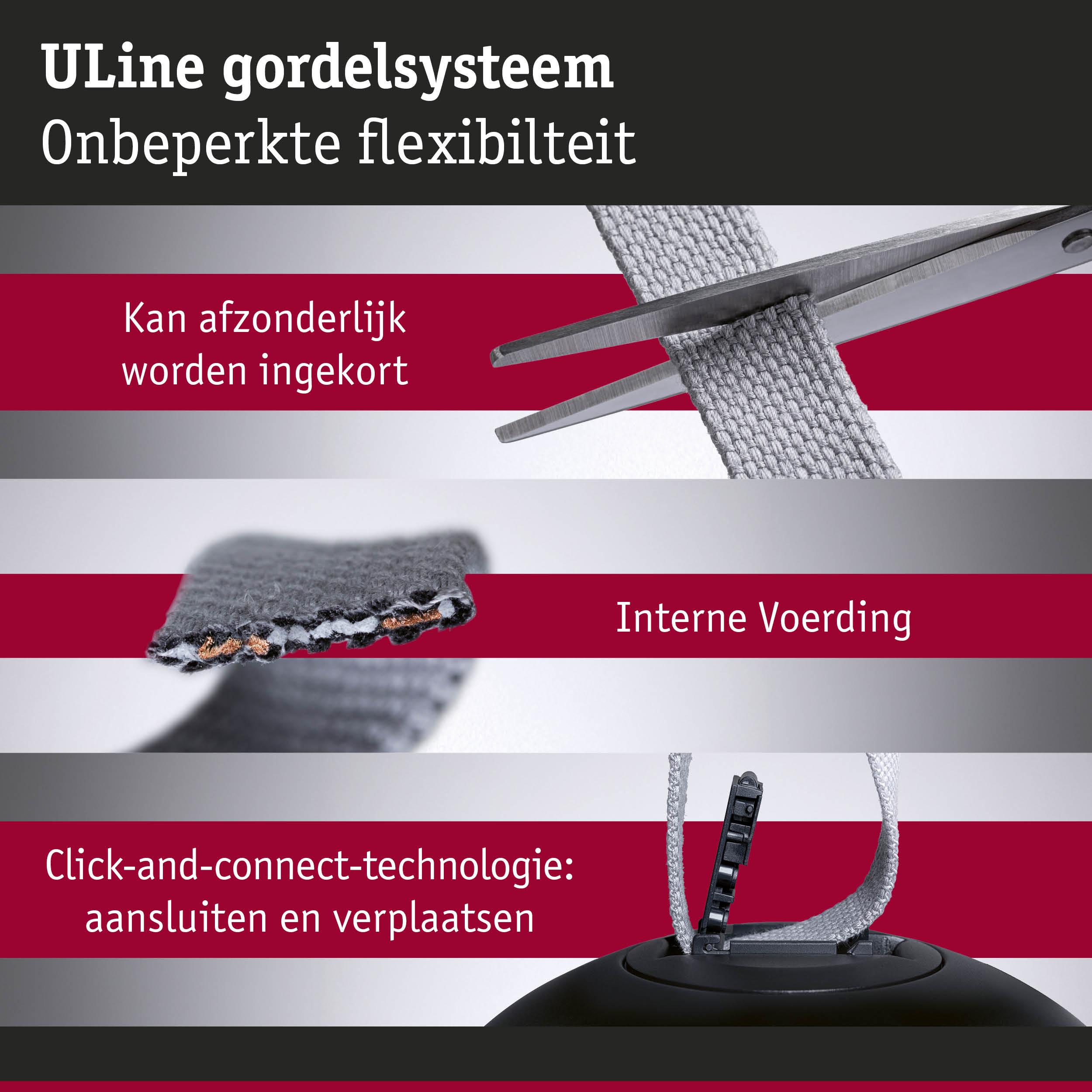 De ULine riem dient als basis voor het ULine riem-systeem. Hij is verkrijgbaar in twee lengtes (5 m en 10 m) en vijf kleuren - van klassiek zwart tot ongewoon oranje - en kan overal in de kamer worden geplaatst en indien nodig met een schaar worden ingekort. Bijpassende armaturen kunnen naar wens op de riem worden geplaatst. De 2,1 cm brede riem wordt met behulp van geschikte beugels aan de wand, het plafond of de vloer bevestigd. Zo kan in slechts een paar stappen een persoonlijk verlichtingsconcept worden geïmplementeerd. Het scheurbestendige en duurzame Textiel, Koper van de riem zorgt voor een lange levensduur en een hoge belastbaarheid. De banden zijn gecoat en gemakkelijk schoon te maken. Een speciaal hoogtepunt is de interne, onzichtbare kabelgeleiding, die zorgt voor een strakke look zonder zichtbare draden. Alles uit de riemen wordt geleverd met twee eindkappen van silicon voor een esthetische afwerking. Het ULine riem-systeem is een innovatieve oplossing voor unieke verlichtingservaringen in alle ruimtedimensies en maakt gerichte lichteffecten op wanden, plafonds en vloeren mogelijk.