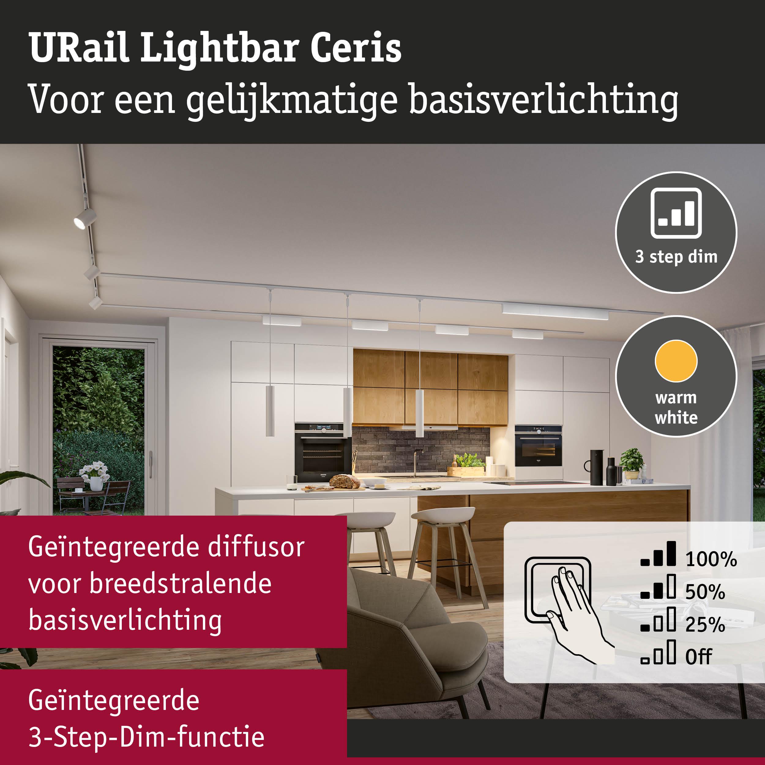 De URail Lightbar Ceris in Signaalwit met een kleurtemperatuur van 3000K creëert een aangename warmwitte lichtsfeer in woonruimtes, werkkamers, gangen of andere ruimtes. De breedstralende diffusor zorgt daarbij voor een niet-verblindende en gelijkmatige lichtverdeling. Door het hoogwaardige aluminium en subtiele design past hij naadloos in individuele woonconcepten. De lengte van 32,2 cm is niet ideaal? Geen probleem - Er kunnen zoveel Lightbars als nodig met elkaar worden verbonden, om voor verschillende ruimtes de perfecte lengte te krijgen. Hiervoor kunnen de eindkappen heel eenvoudig worden afgenomen en met de meegeleverde verbindingen tot de gewenste lengte worden uitgebreid. Verbinden met de Lightbar Zelos is ook probleemloos mogelijk. Een ander voordeel is de 3-stepdimfunctie waarmee de helderheid in drie standen kan worden ingesteld met een gewone lichtschakelaar. De geïntegreerde geheugenfunctie slaat de laatst gebruikte instelling op tot het volgende inschakelen, voor maximaal comfort.
