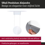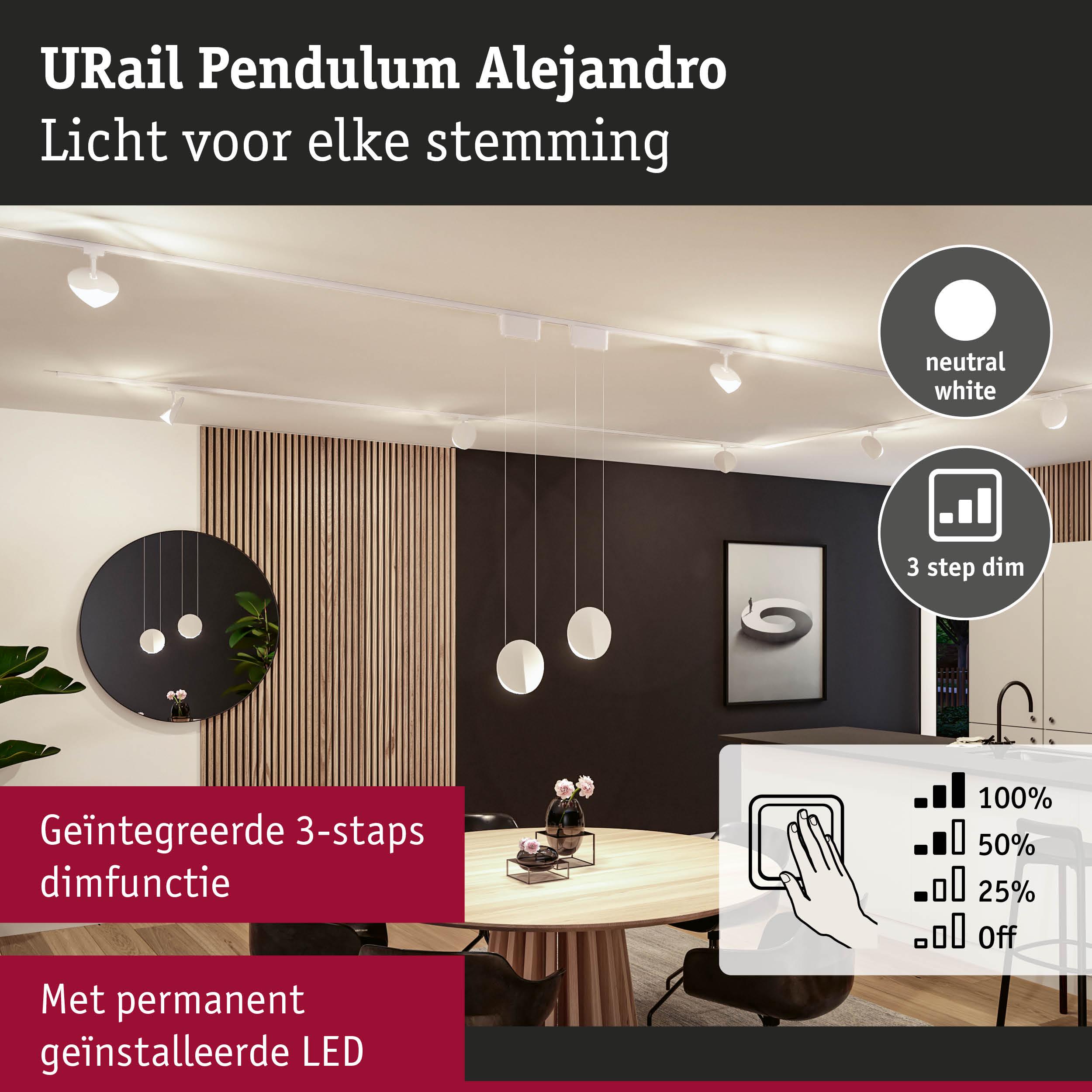 De URail hanglamp Alejandro in Signaalwit is een blikvanger aan het plafond en geeft met het stijlvolle design de ruimte een extra accent. Met de 3-Step-Dim functie kan het licht eenvoudig worden geregeld via de bestaande wandschakelaar zonder dat er een extra wanddimmer nodig is. Met de dimniveaus van 100%, 50% en 25% biedt de hanglamp een flexibele lichtbesturing, die voor elke stemming en situatie geschikt is. De 4000 kelvin zorgen voor een aangenaam neutraal wit licht, dat de ruimte optimaal verlicht. Door de verzonken LED-chips met diffusor wordt het licht niet verblindend en gelijkmatig verdeeld, hetgeen voor een aangename sfeer zorgt. Bijzonder praktisch is de memory- en resetfunctie, die het mogelijk maakt om de laatste helderheidsinstelling te behouden of opnieuw in te stellen indien dat nodig is. Het design van de hanglamp voegt een zekere elegantie toe aan elke ruimte en plaatst stijlvolle accenten.